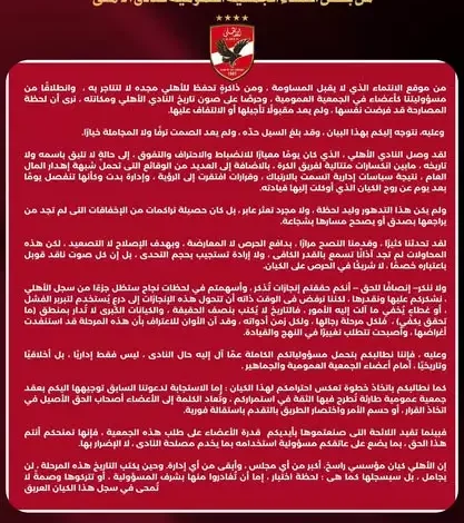 وطالب الأعضاء في ختام بيانهم بضرورة اتخاذ خطوة حاسمة، سواء بالدعوة لجمعية عمومية طارئة تُعرض فيها الثقة، أو تقديم استقالة جماعية، مؤكدين أن الأهلي كيان مؤسسي يتجاوز أي إدارة، وأن التاريخ سيحكم على هذه المرحلة بما يليق بحجم النادي وتاريخه.