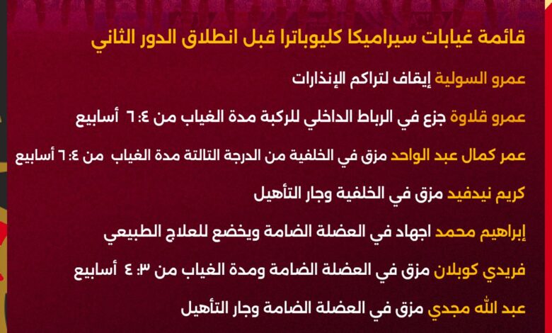 وتُعد هذه الغيابات ضربة قوية للجهاز الفني لسيراميكا كليوباترا، خاصة مع وجود عدد كبير من اللاعبين الأساسيين في القائمة، مما يزيد من صعوبة مهمة الفريق في المرحلة الختامية من الدوري.