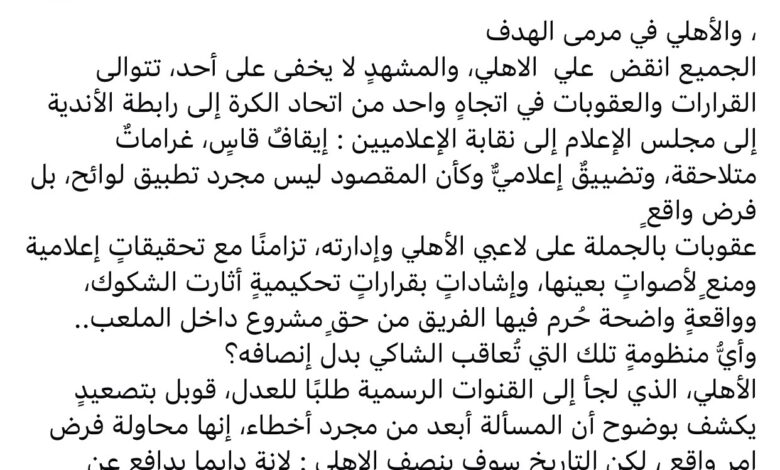وأضاف: “وأيُّ منظومةٍ تلك التي تُعاقب الشاكي بدل إنصافه؟ الأهلي، الذي لجأ إلى القنوات الرسمية طلبًا للعدل، قوبل بتصعيدٍ بكشف بوضوح أن المسألة أبعد من مجرد أخطاء، إنها محاولة فرض امر واقع”.